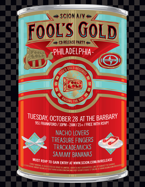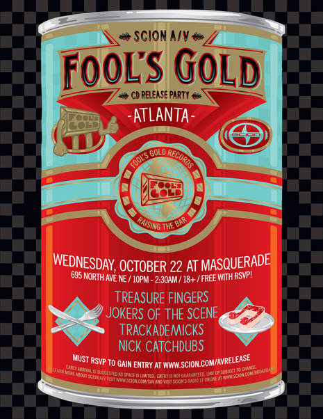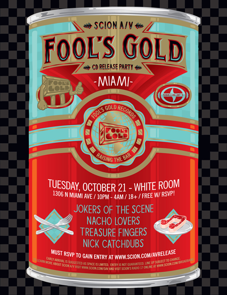 You’ll be able to purchase the remixes from all fine digital retailers starting October 14th, and pick up physical copies for free at various Scion dealerships, parties and sponsored events…including our four-city Fool’s Gold Remixed promo tour, which hits Miami, Atlanta, Philly and Baltimore starting October 21st. The rotating lineup includes Jokers Of The Scene, Treasure Fingers, Trackademicks, Nacho Lovers, Sammy Bananas and Nick Catchdubs, and entry is free with RSVP - check you there! Peep the full CD tracklistings and show info for each city on the tour after the jump.